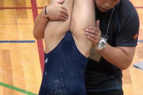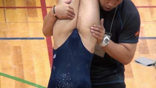 コーチが逆立ちした選手(紺レオタ)の太ももを鷲掴みして支えています。コーチも大変です。