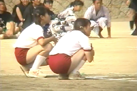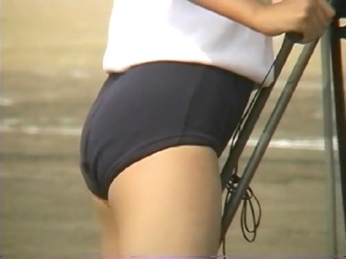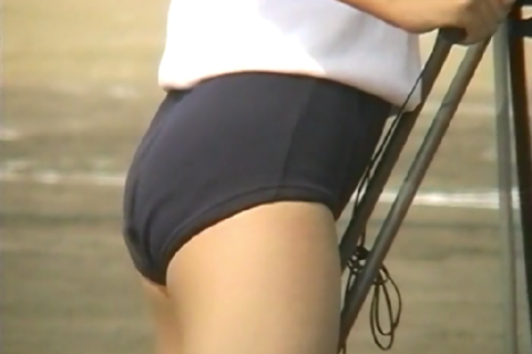 肝心のブルマですが、紺、緑、エンジおそらく学年カラーで体操服も同様。あまりアップのシーンがないため特定が難しいが、カラーにあわせてタグの色も同色になっているので、ジャックマンかHitunionかと推測します。ピタピタのナイロンブルマが形のいいお尻を表現してくれます。