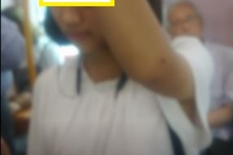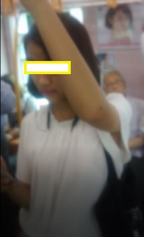 一人目:大学生ぐらいでしょうか。夏場で薄着なので胸の膨らみがしっかり見えていますね。そして脇がオープンなのも油断している証拠でしょう。