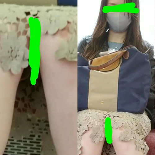 電車乗り、斜め前から下半身覗き