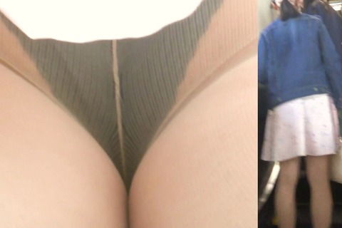 すると彼女は駅の改札に向かう上りエスカレーターの方へ歩いて行きました。このエスカレーターが撮り場と見て、彼女の背後に接近します。そして彼女がエスカレーターに乗ったところでスカートの中へカメラを差し込みました。そして撮影に気付かれていないことを確認したところで、スカートの奥深くへとカメラを突っ込んでパンツを接近撮影してやりました。