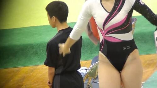 冒頭登場するゼッケン37番のブルーレオタの選手、平均台の練習中、ターンした後美尻からアンダーショーツがはみ出て…。この選手、実はさすらいの絵師体操競技シリーズの他の作品にも多数登場する有名選手。とにかく競技のレベルが高く、体のムチムチ感が半端ありません。要注目選手です。その後は、赤白レオタードチームの平均台の練習風景の後、ゼッケン48番の白黒レオタードの選手の平均台の練習風景。この選手も何気にアンダーショーツがはみ出てしまっています。最後はゼッケン38番の選手の平均台。プリンとしたかわいいお尻がチャーミング。どんどん食い込んでいき…。