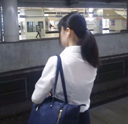 三人目:リクルートスーツの女性が電車待ちしていますね。まだ白シャツのことを分かっていないのか、後ろから白いブラが見えていますね。興奮しますね(*´Д`)ハァハァ