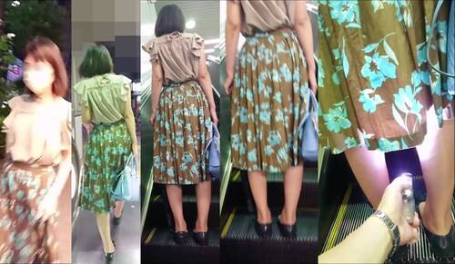 30代半ばくらいの上品そうな女性です。後ろ姿も凛とした印象を受けました。中身は黒で部分的に網タイツのような作りをしていました。2回目はスカートのインナーに邪魔されました。