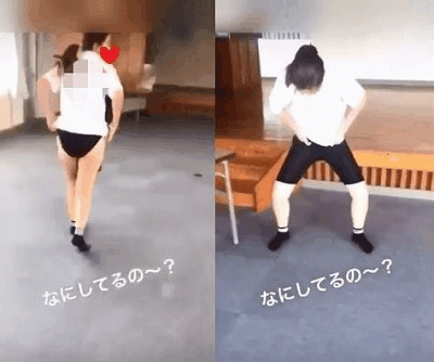 歌に合わせてダンスをしあっていまが、そのうちの一人は上半身裸にスパッツ姿。