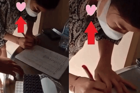 女性がテーブルの上の紙にサイン?的なものを記しています。