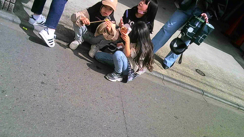 路上で休憩中