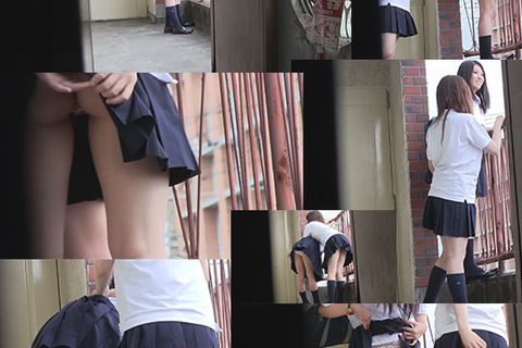 この階が4回ということもあって、暇を持て余したJKたちは下の道を歩く人になぜかスカート捲り公開。友達のスカートを捲ってみたり、自分のスカートの中を晒してみたり。