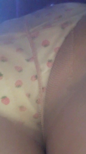 ベージュのパンストに透ける彼女のパンツは、かわいいイチゴ柄の白パンツでした。