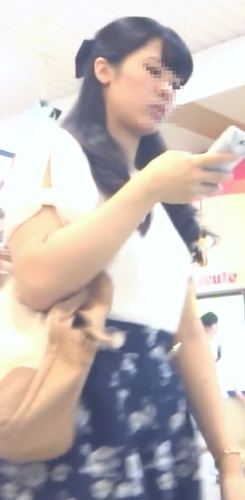 彼女は紺色の花柄ミニスカートを履いていました。裾が広がり気味のスカートでしたので、中にカメラを入れ込むにはちょうど良さそうです。そこですぐにカメラを準備して撮影を開始しました。そして背後から彼女に近づいて行きます。