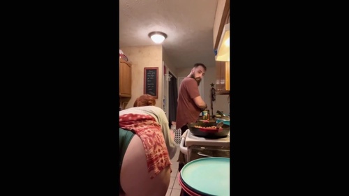 旦那が隣で料理を手伝ってくれていますが、イキそうなお母さん
