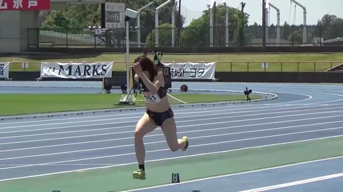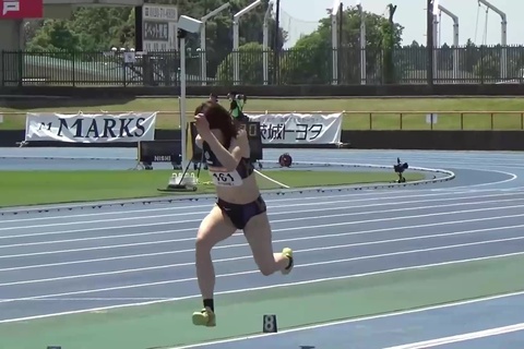 レーシングブルマやスパッツを履いた鍛え上げられた肉体で女子大生が走り幅跳びに