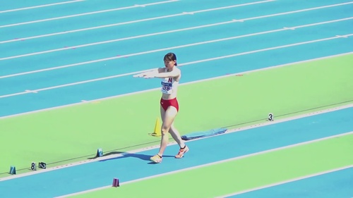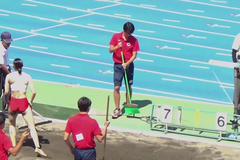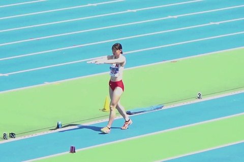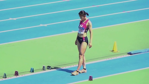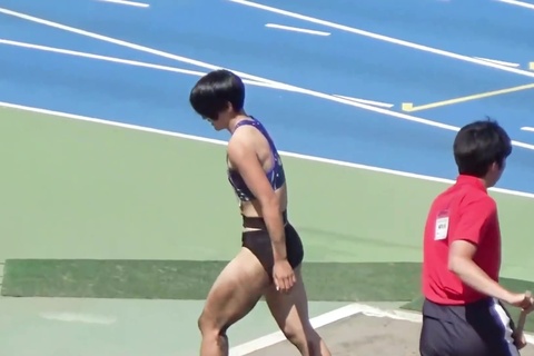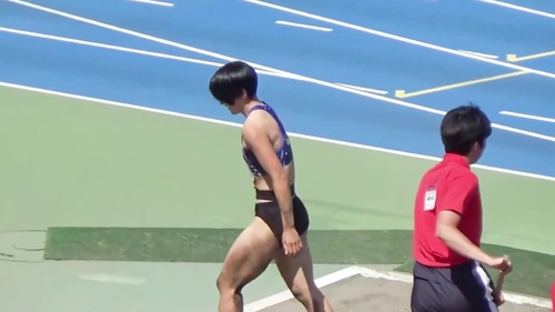 レーシングブルマやスパッツを履いた鍛え上げられた肉体で女子大生が走り幅跳びに挑戦します。