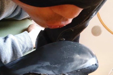 スマホも自分で角度つけて丁度靴底が見える素晴らしいアングル、舌を出している上にすり減った靴底