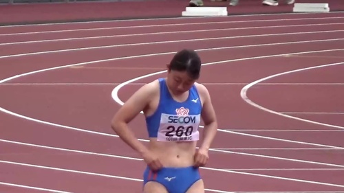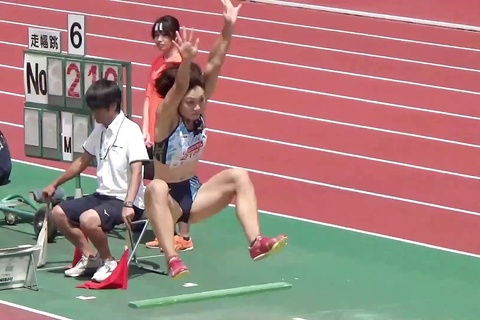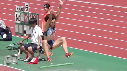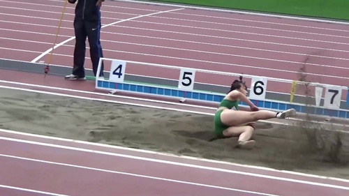 レーシングブルマやスパッツを履いた鍛え上げられた肉体で女子大生が走り幅跳びに