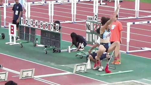 レーシングブルマやスパッツを履いた鍛え上げられた肉体で女子大生が走り幅跳びに