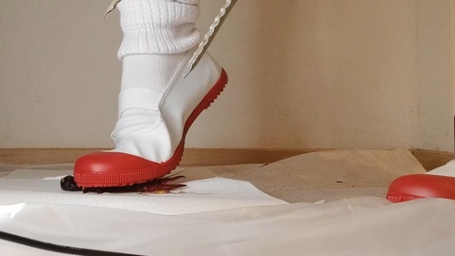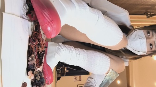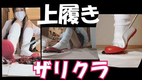 カメラの真ん前にザリガニを置いて踏み潰し、2匹目も上に置いては同時に無茶苦茶に踏み潰し、座りながらパンツもチラ見せしながらくちゃくちゃ、立っては全体重をかけグチャグチャに