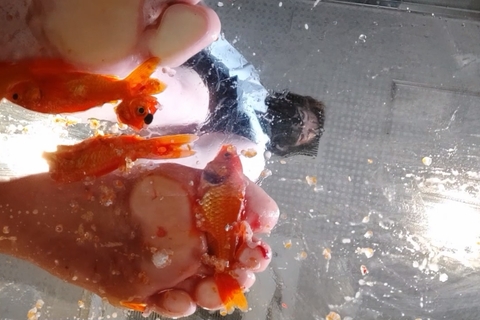 またまた貴重な生足金魚編新作です、4匹を並べ、体重をかけて潰そうとしますが、うろこがヌメヌメしてすぐに足に裏から離れてしまうので難しそうです。