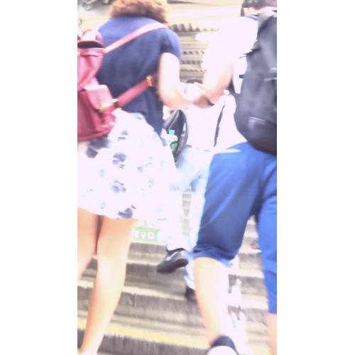 彼女は白い花柄ミニスカートを履いていました。プリーツがかかっていないタイプのスカートだったので、パンチラしやすそうです。これは撮るしかありません。チャンスを伺いながら後をつけていきます。