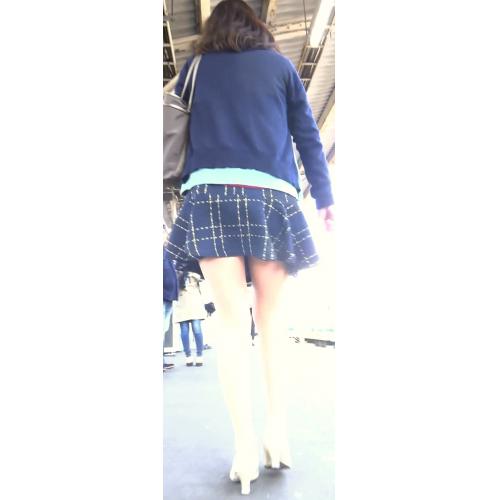 彼女は紺色チェック柄の超ミニスカートを履いていました。このスカートがものすごいミニ丈のスカートで、しかも裾がヒラヒラしており、今にもスカートがめくれ上がってパンツが見えそうな感じです。これを見たら撮らないではいられません。すぐにカメラを準備して撮影を開始しました。そして彼女を追いかけながらチャンスをうかがいます。