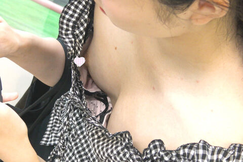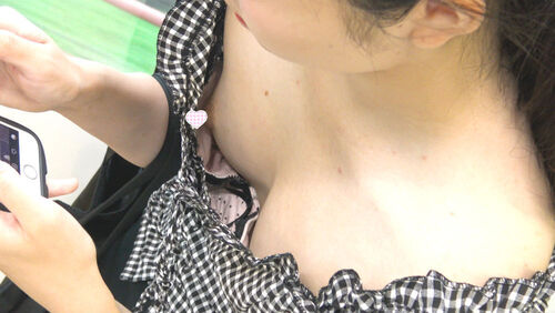 スマホを両手で持つことにより胸元が緩んでしまっています。